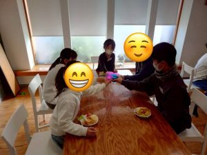 お菓子とジュースの準備をして、まずは今年一年、お疲れさまでした~!!とみんなでジュースで乾杯🥂