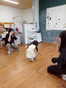 しゃがんで歩いたり、膝をついて歩いたりと縄を意識して体を動かすことができていました。