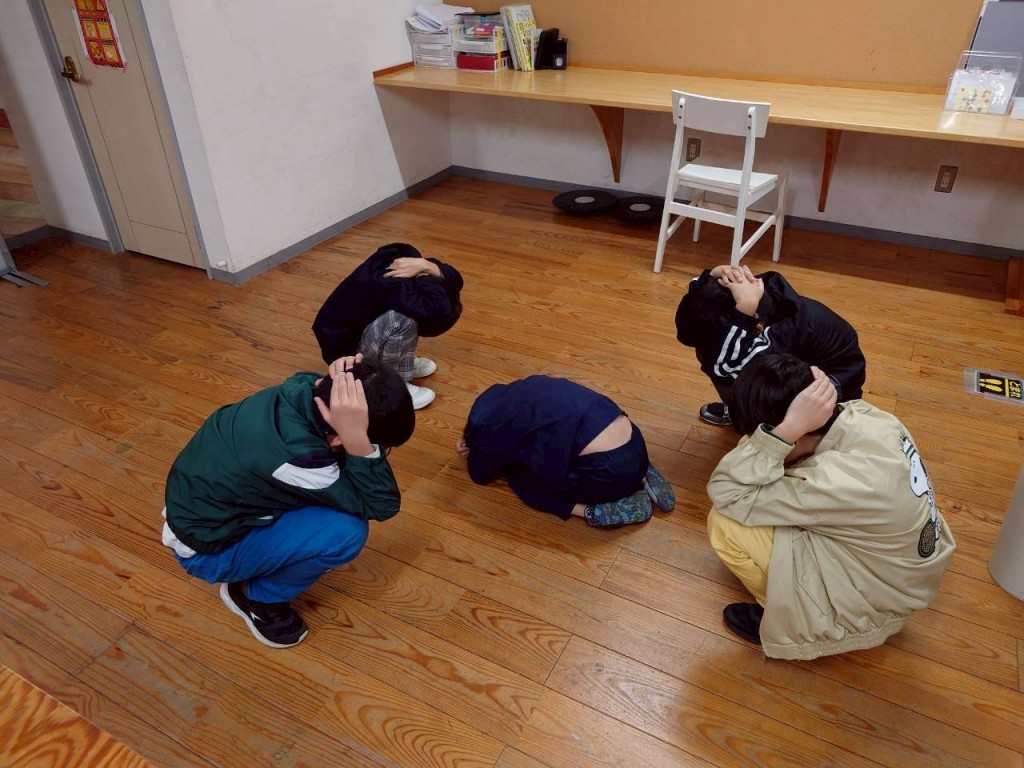 頭を守りながら室内の真ん中に集まり、地震が収まるのを待ちます。